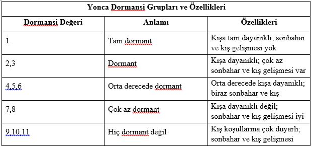 Dormansi kavramını dinlenme veya uyku hali olarak tarif edebiliriz. Sonbahar dormansisini bilirsek, yoncanın gelişiminin sonbaharda ne zaman durdurduğunu ve ilkbaharda ne zaman başladığını anlayabiliriz. Ayrıca kış soğuklarına dayanıklılığı da yonca tohumu dormansi gruplarından öğrenebiliriz. Bu nedenle en iyi yonca tohumunu tespit etmek için dormansi değeri en önemli verimizdir.