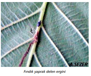 Fındık yaprak deleni ergini grimsi siyah renkte, 2-3 mm boyunda, kısa ve küt hortumludur.