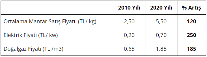 Bu tabloya göre son 10 yılda üreticinin kültür mantarı satış fiyatı %120 artarken, mantar üreticisinin işletmesinde kullandığı doğalgaz fiyatı %185, elektrik fiyatı %250 artmış. Karlılığın her geçen gün azaldığını bu rakamlardan anlayabilirsiniz.