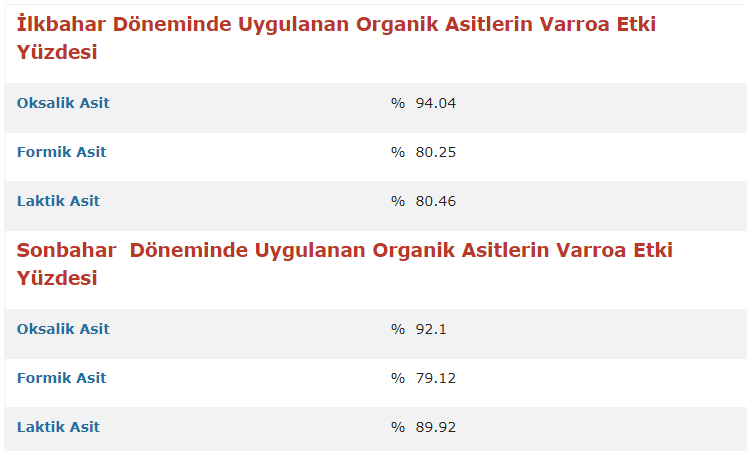 Ege bölgesinde yapılan bilimsel bir çalışmada , varroa mücadelesi için kullanılan organik asitlerin etki derecesi şu şekilde bulunmuştur.