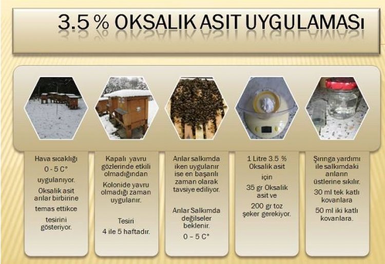 10 kovanlık bir arı kolonisi için 15 gr Oksalik asit + bir su bardağı su , 200 gr toz şeker karıştırılarak solüsyon yapılır.